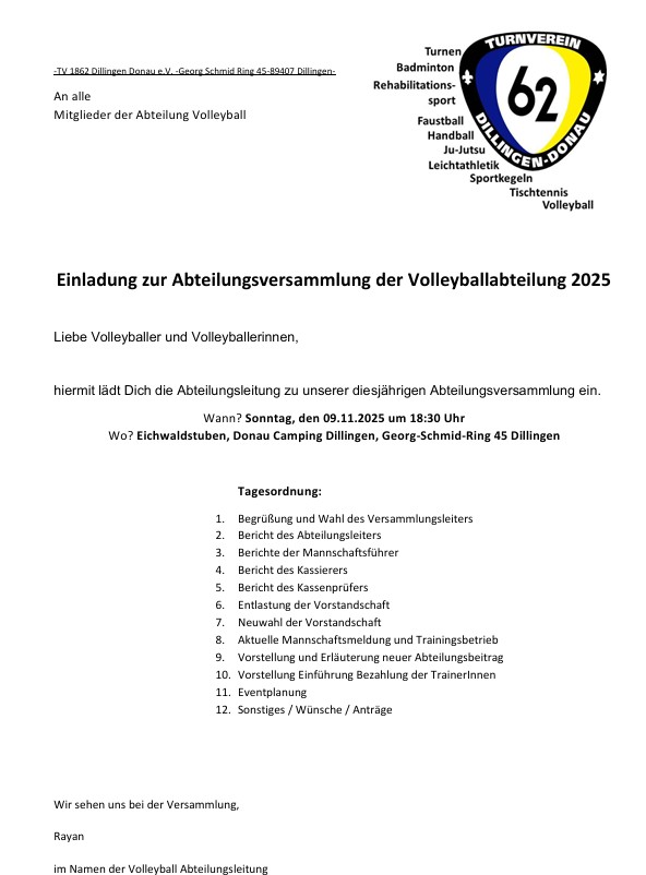 Einladung zur Abteilungsversammlung der Volleyballabteilung 2025