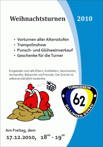 Am 17.12.2010 findet von 18:00 bis 19:00 Uhr in der Sebastian-Kneipp Halle das alljährliche Weihnachtsturnen der Geräteturner statt. Neben dem Verkauf von Punsch und Glühwein bieten die Turner des TV Dillingen eine Trampolinshow der Extraklasse sowie Darbietungen ihres Könnens an sämtlichen Geräten. Von Klein bis Groß ist alles vertreten. Wer möchte kann gerne Plätzchen zum anschließenden Verzehr mitbringen. Durch einen Klick auf den Flyer rechts kann dieser vergrößert werden.