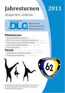 Das diesjährige Jahresturnen 2011 findet ganz unter dem Motto unserer Kreisstadt statt: DLG (Dynamisch, L(i)ebenswert & Gemeinsam Gut). Die Sportler und Sportlerinnen werden Sie mit spannenden und definitiv kurzweiligen Vorführungen und Shows verwöhnen. Dynamisch geht es bei jeder der Aufführungen zu. Die Rhythmische Sportgymnastikgruppe von Karin Krebs wird einen aufregenden Tanz präsentieren, gefolgt von den liebenswerten Nachwuchsturnern und Turnerinnen, die am Sprung und Balken ihr können demonstrieren werden. Dass man Gemeinsam Gut sein kann, zeigt der finale Auftritt der Turner mit den Turnerinnen. Sie werden zusammen am Boden eine Vorführung der Extraklasse bieten.